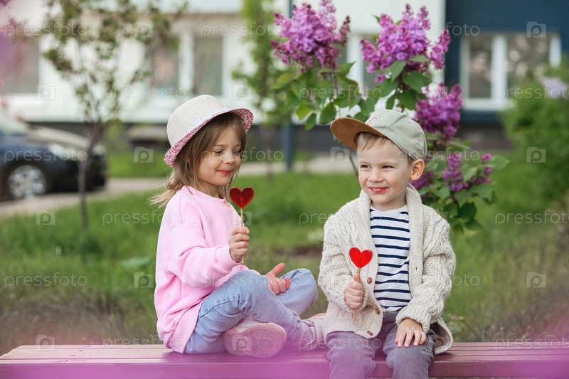 Образ жизни. Маленькие красивые дети играют на скамейке с леденцами на палочке в форме сердца. Концепция детской дружбы и первой любви