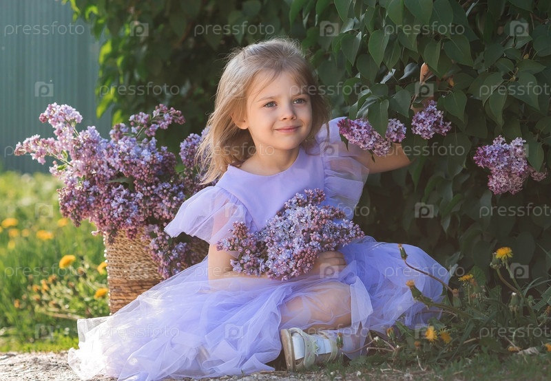 Весеннее цветение. Портрет красивой маленькой девочки 4 лет в сиреневом платье с букетом сиреневых цветов на природе. Детство. Ребенок позирует и смотрит в камеру