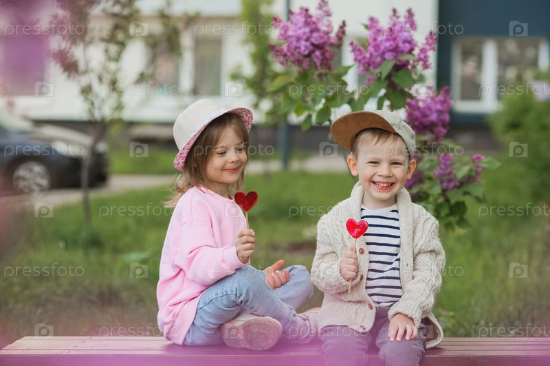 Образ жизни. Маленькие красивые дети играют на скамейке с леденцами на палочке в форме сердца. Концепция детской дружбы и первой любви