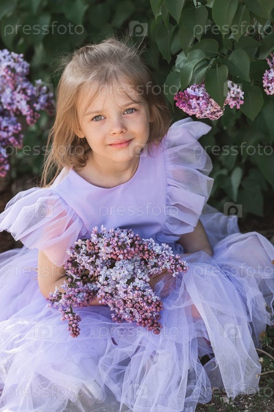 Весеннее цветение. Портрет красивой маленькой девочки 4 лет в сиреневом платье с букетом сиреневых цветов на природе. Детство. Ребенок позирует и смотрит в камеру
