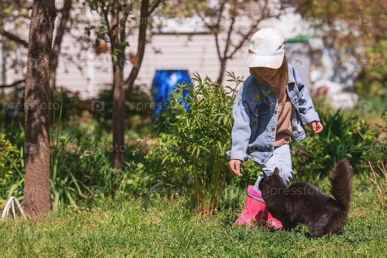 Маленькая девочка в стильной одежде играет с черной кошкой в открытом летнем саду. Концепция ухода за домашними животными. Дети и животные