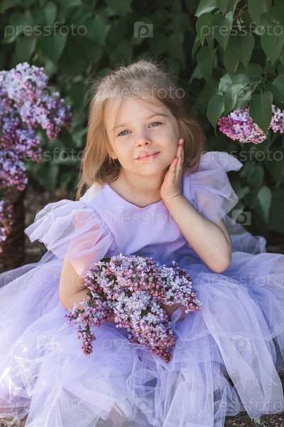 Весеннее цветение. Портрет красивой маленькой девочки 4 лет в сиреневом платье с букетом сиреневых цветов на природе. Детство. Ребенок позирует и смотрит в камеру