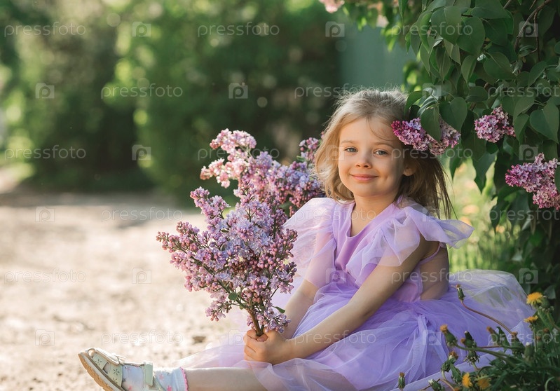 Весеннее цветение. Портрет красивой маленькой девочки 4 лет в сиреневом платье с букетом сиреневых цветов на природе. Детство. Ребенок позирует и смотрит в камеру