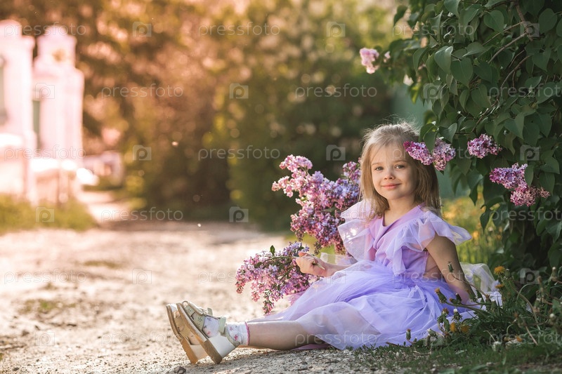 Весеннее цветение. Портрет красивой маленькой девочки 4 лет в сиреневом платье с букетом сиреневых цветов на природе. Детство. Ребенок позирует и смотрит в камеру