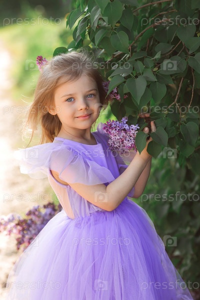 Весеннее цветение. Портрет красивой маленькой девочки 4 лет в сиреневом платье с букетом сиреневых цветов на природе. Детство. Ребенок позирует и смотрит в камеру