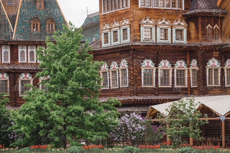 Городской ландшафт. Популярная туристическая достопримечательность. Визитная карточка Москвы. Деревянный дворец царя Алексея Михайловича в Коломенском. Россия, Москва, май 2023 г