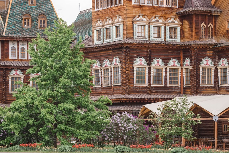 Городской ландшафт. Популярная туристическая достопримечательность. Визитная карточка Москвы. Деревянный дворец царя Алексея Михайловича в Коломенском. Россия, Москва, май 2023 г