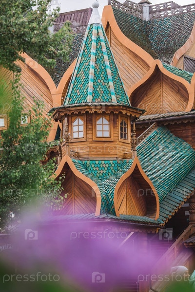 Городской ландшафт. Популярная туристическая достопримечательность. Визитная карточка Москвы. Деревянный дворец царя Алексея Михайловича в Коломенском. Россия, Москва, май 2023 г