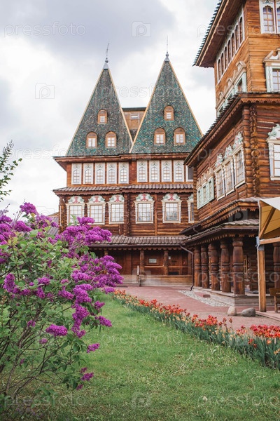 Красивая, пушистая сирень на фоне дворца царя Алексея Михайловича в Коломенском. Россия, Москва, май 2023 г