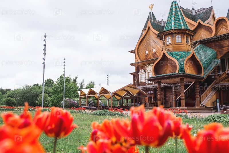 Дворец царя Алексея Михайловича в Коломенском расцвел красными тюльпанами. Россия, Москва, май 2023 г