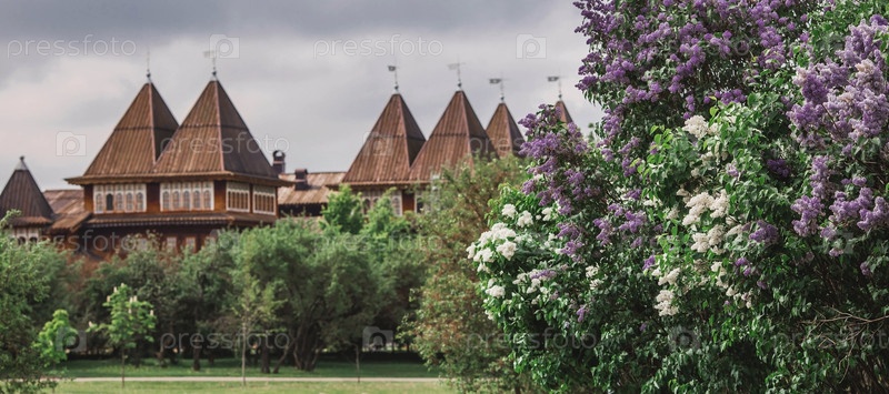 Красивая, пушистая сирень на фоне дворца царя Алексея Михайловича в Коломенском. Россия, Москва, май 2023 г