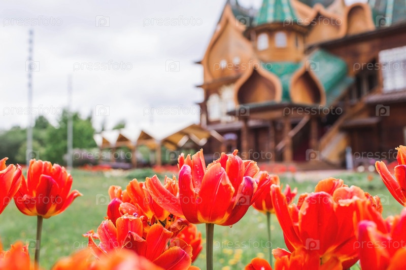 Дворец царя Алексея Михайловича в Коломенском расцвел красными тюльпанами. Россия, Москва, май 2023 г