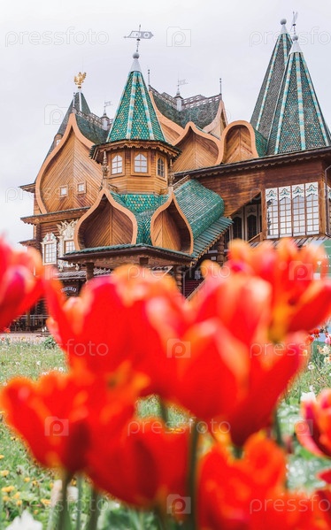 Дворец царя Алексея Михайловича в Коломенском расцвел красными тюльпанами. Россия, Москва, май 2023 г