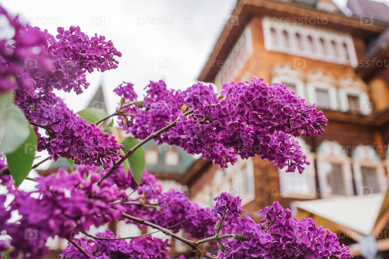 Красивая, пушистая сирень на фоне дворца царя Алексея Михайловича в Коломенском. Россия, Москва, май 2023 г
