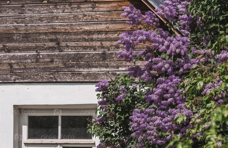 Пушистая, цветущая сирень у старого дома. Красивый цветочный фон. Крупные гроздья сирени. Коломенский парк. Россия, Москва, май 2023 г