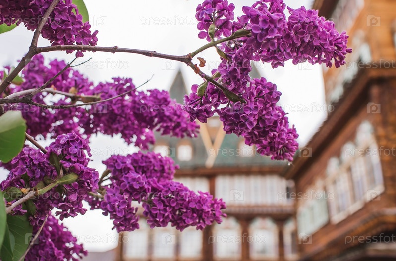 Красивая, пушистая сирень на фоне дворца царя Алексея Михайловича в Коломенском. Россия, Москва, май 2023 г