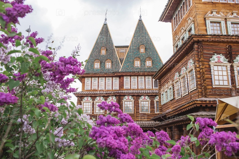Красивая, пушистая сирень на фоне дворца царя Алексея Михайловича в Коломенском. Россия, Москва, май 2023 г
