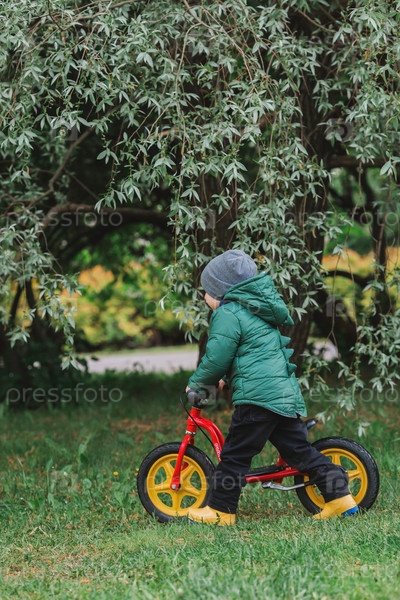 Весной маленький мальчик играет на улице. Портрет ребенка