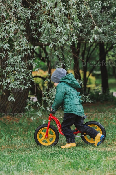 Весной маленький мальчик играет на улице. Портрет ребенка