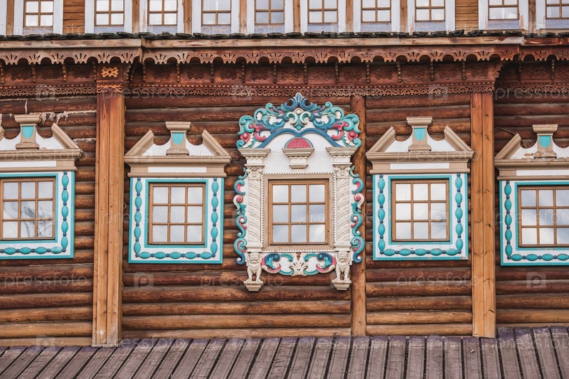 Городской ландшафт. Популярная туристическая достопримечательность. Визитная карточка Москвы. Деревянный дворец царя Алексея Михайловича в Коломенском парке. Фрагмент. Окна с красивыми резными наличниками. Москва, Россия, май 2023 г
