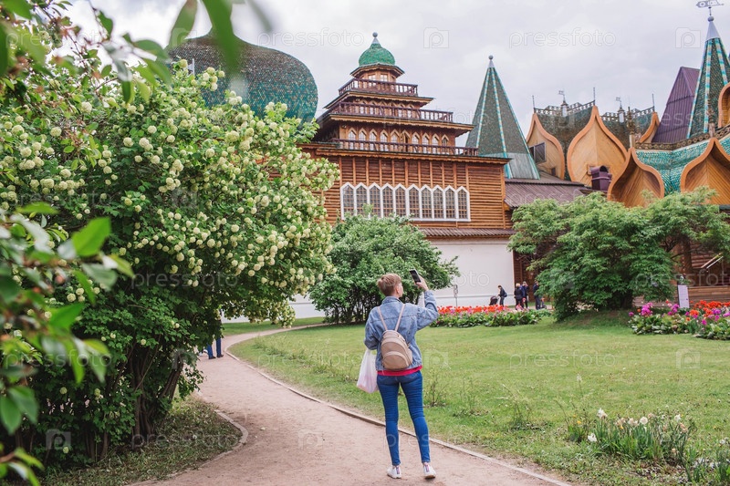 Городской ландшафт. Популярная туристическая достопримечательность. Визитная карточка Москвы. Деревянный дворец царя Алексея Михайловича в Коломенском. Турист фотографирует достопримечательности. Россия, Москва, май 2023 г