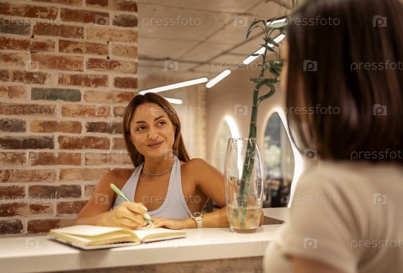 Женщина-администратор, работающая в салоне красоты и записывающая встречу с женщиной-клиентом