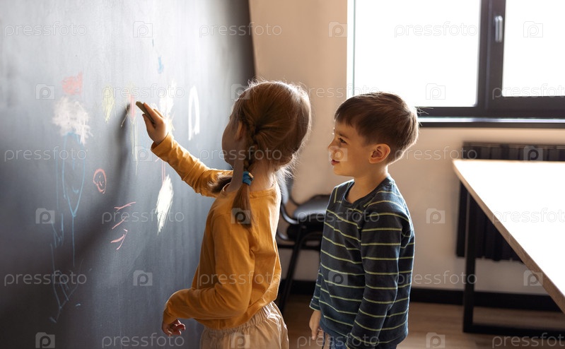 Милая маленькая девочка и мальчик рисуют карандашом на стене
