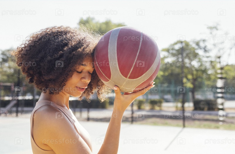 Стильная крутая девушка-подросток собирается на баскетбольной площадке, играет в баскетбол на открытом воздухе