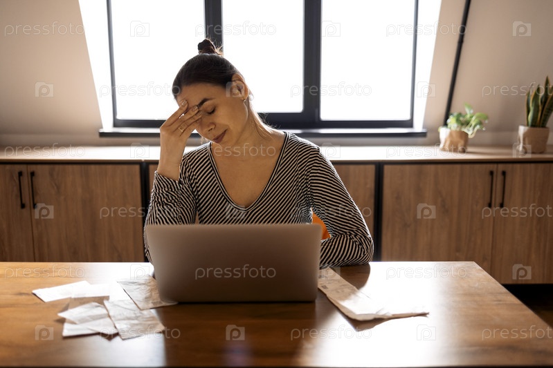 Серьезная домохозяйка сидит за столом на домашней кухне, проверяет счета за дом