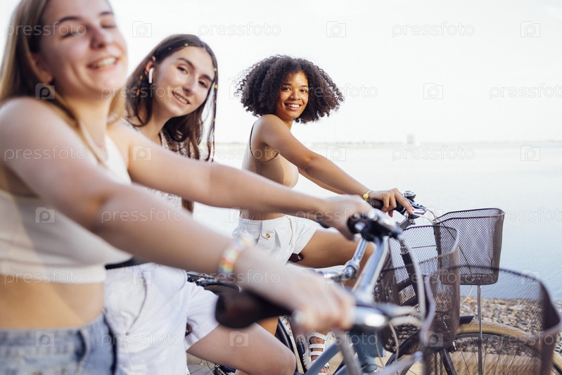 Подростки разных национальностей и внешности на велосипедах едут по улице города