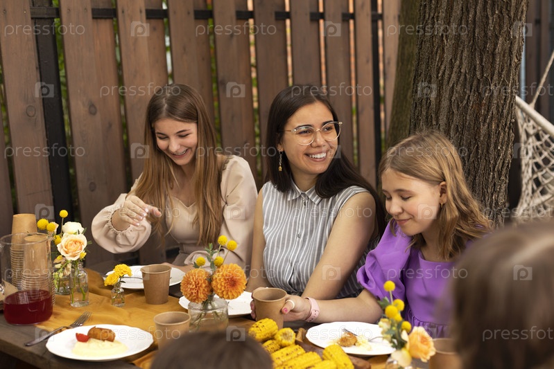Счастливые дети и подростки на дне рождения в летнем саду на открытом воздухе
