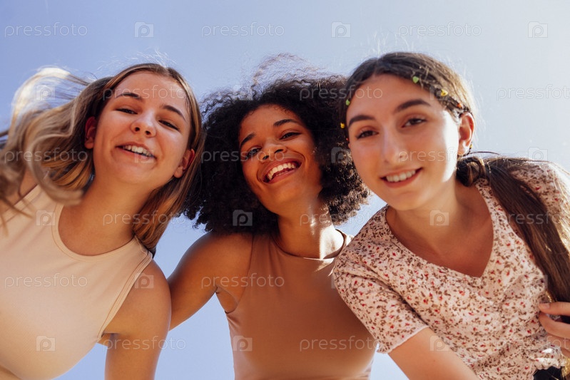 Группа подростков разных национальностей и внешности вместе развлекается