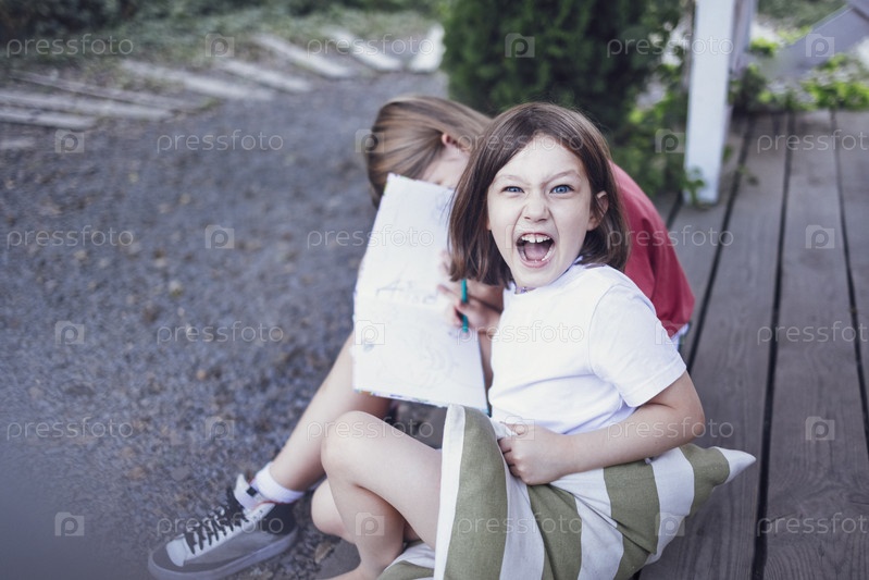 Две маленькие девочки сидят на подушках на деревянном полу открытого крыльца дома