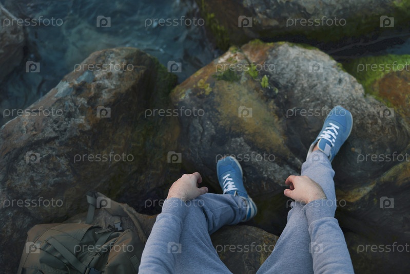 Кавказский парень в синем свитере и желтой шляпе держит свой рюкзак и смотрит на спокойное море