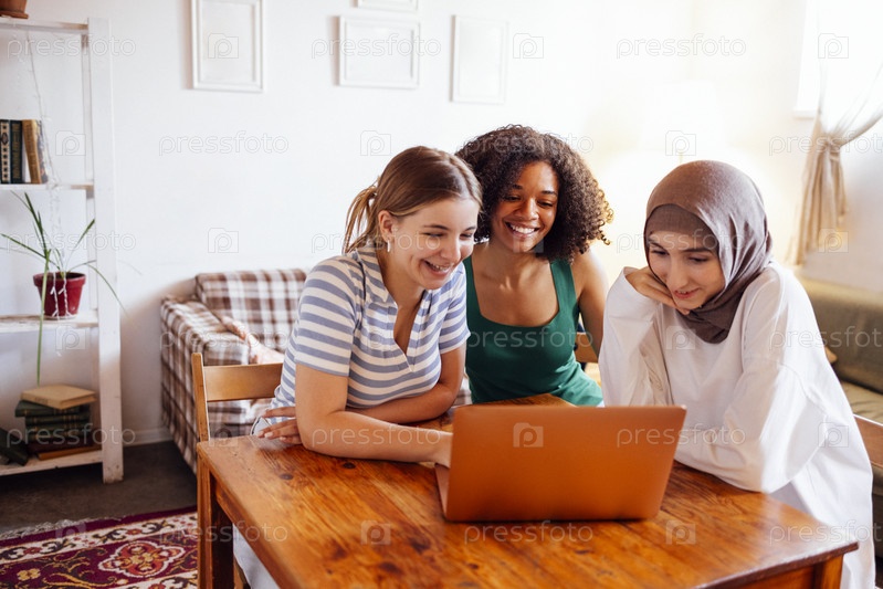 Три симпатичные девушки-подростки разных национальностей смотрят на экран ноутбука и смеются