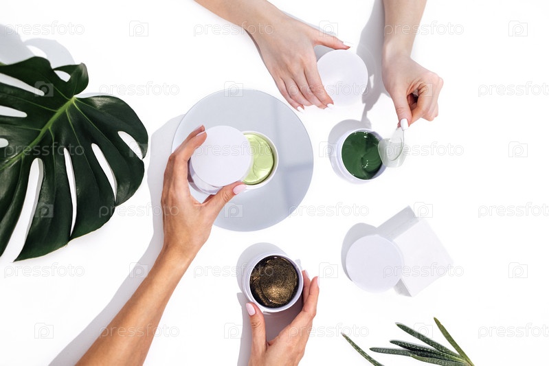 Две пары ухоженных женских рук с легким маникюром держат круглые коробочки с заплатками. Растение алоэ и лист монстера на белом фоне