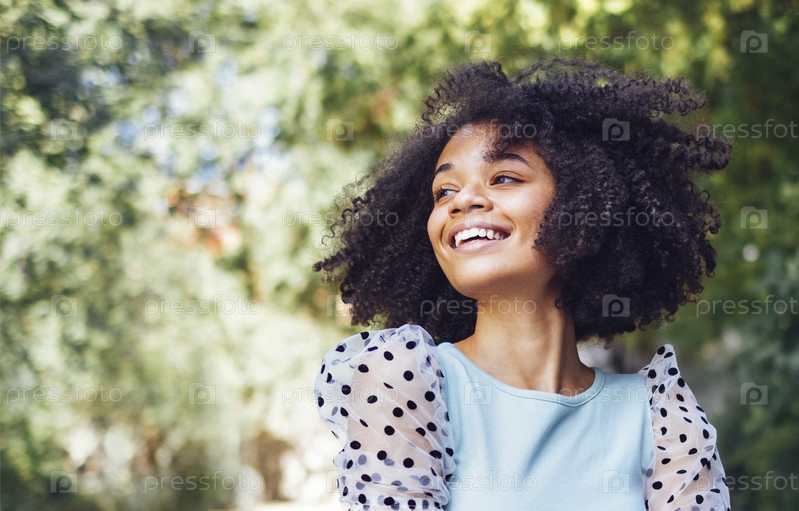 Счастливая афроамериканская девочка-подросток в повседневной одежде. Улыбающаяся темнокожая девочка-подросток, гуляющая по параллели