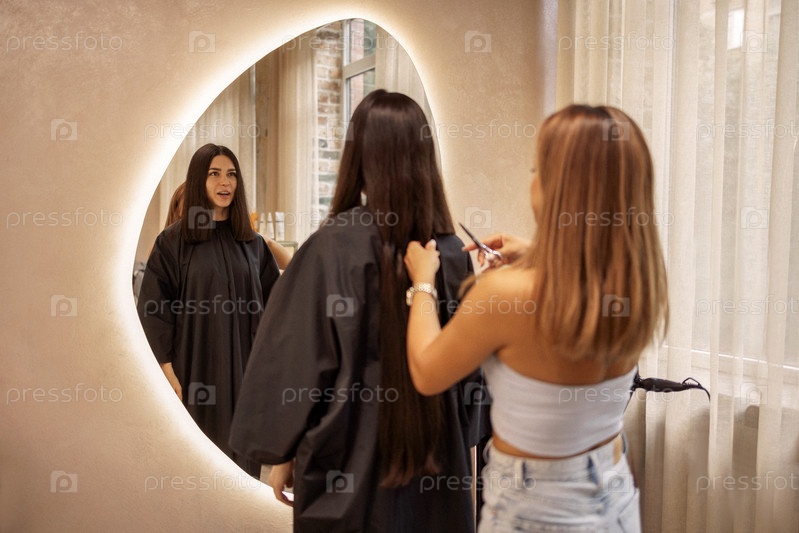Блондинка-парикмахер стрижет волосы клиентки в салоне красоты. Симпатичная брюнетка смотрит в огромное зеркало, когда ее роскошные длинные волосы отрезаются