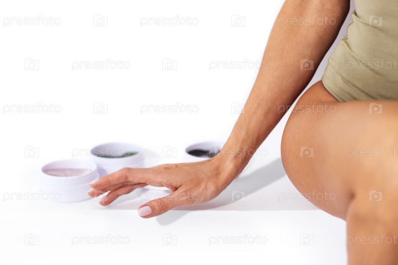 Крупным планом женская ухоженная рука с белым маникюром. Женщина выбирает патчи. Три банки разноцветных коллагеновых повязок для глаз на белом фоне