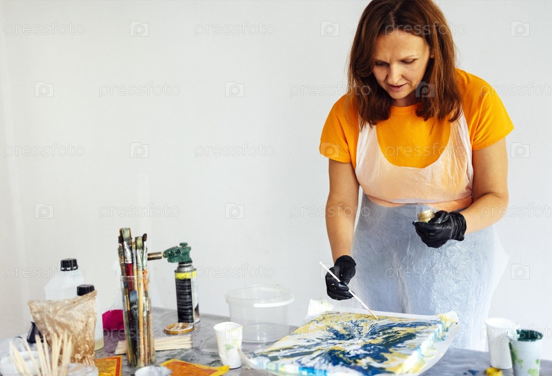 Учебник по живописи. Белая женщина в перчатках рисует жидким акрилом в художественной мастерской