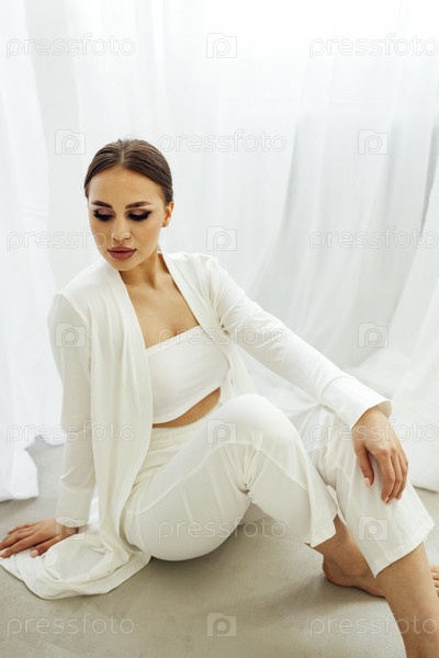 Молодая женщина с красивым вечерним макияжем в белом топе, рубашке и брюках
