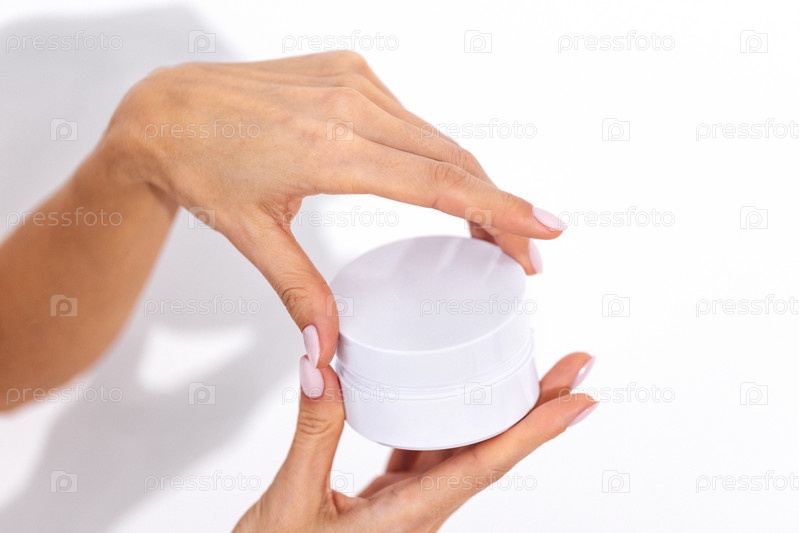 Чрезвычайно крупный план красивых изящных женских рук с белым маникюром, держащих макет круглой коробки для косметики