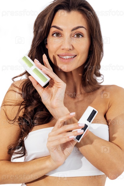Красивая смеющаяся кавказская женщина держит макеты белой трубки и коричневой бутылки с сывороткой