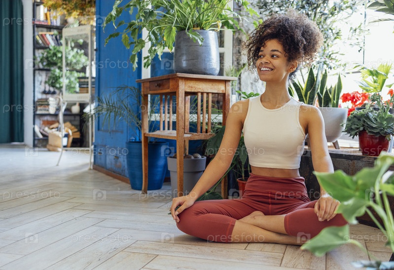 Афроамериканская этническая женщина в спортивной одежде сидит в позе йоги