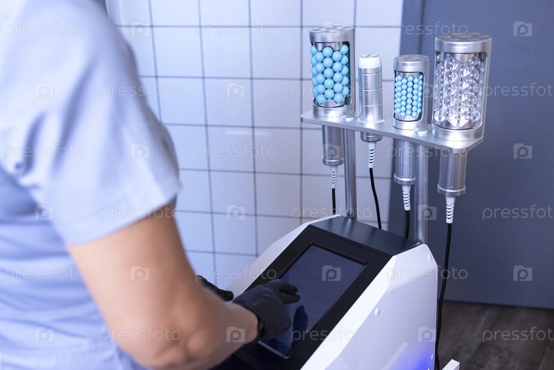 Безликий косметолог с помощью массажера убирает жир с бедер анонимного клиента