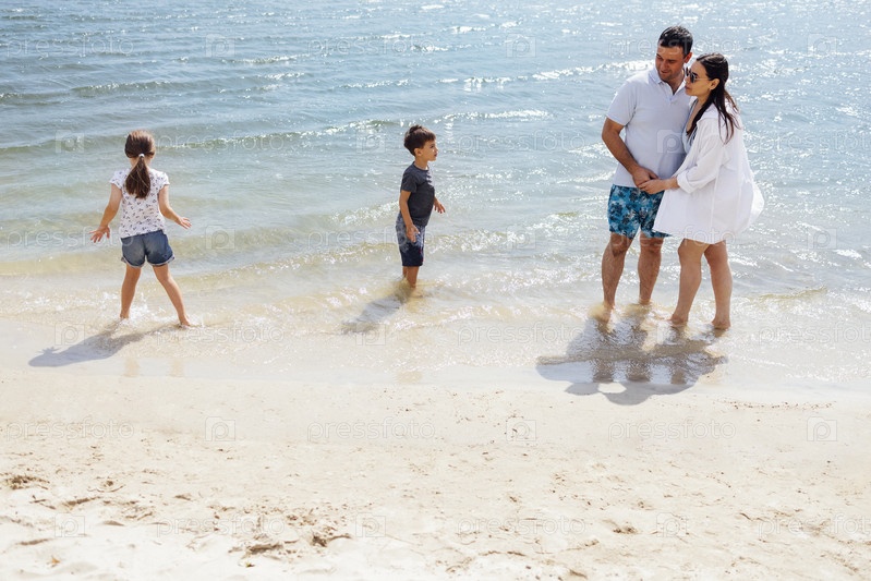 Сын и дочь бегают по воде и брызгают на улыбающихся родителей