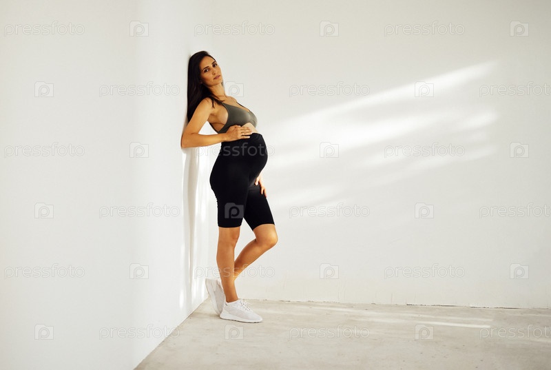 Красивая молодая беременная женщина в спортивном топе и леггинсах