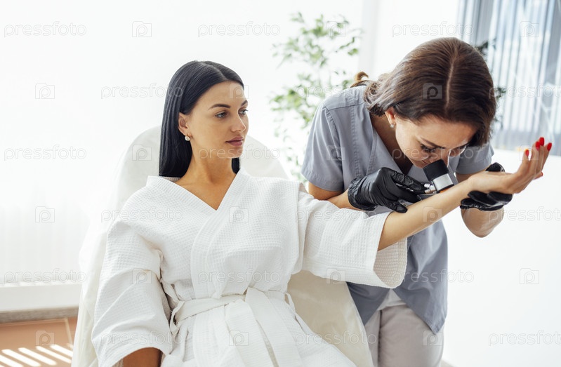 Врач-дерматолог осматривает кожу лица клиента салона красоты с помощью дерматологической линзы