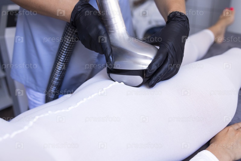 Мастер делает лимфодренаж клиенту в специальном белом костюме в области живота. Крупный план аппаратной процедуры для похудения