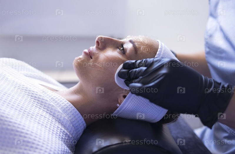 Крупный план красивой молодой брюнетки во время чистки лица и массажа